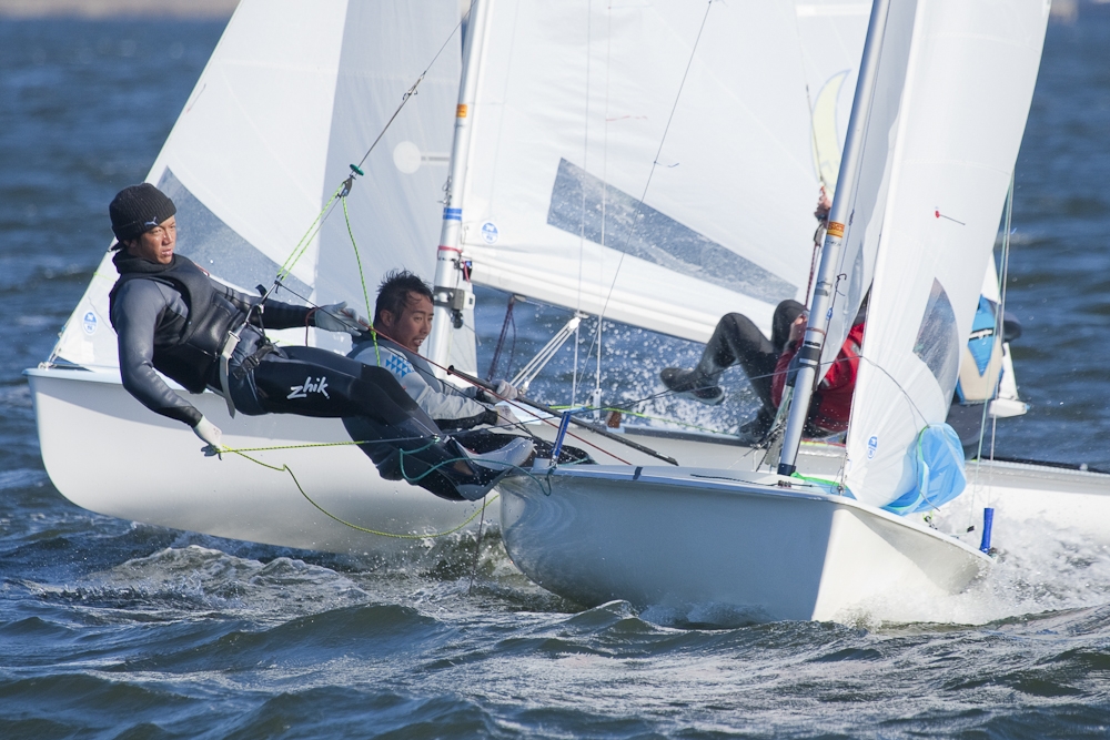 大会3日目、この日からゴールドフリート・シルバーフリートに分かれて決勝レースです。風は北西で3m/s~9m/sと強弱が激しく、ブローが入ると10メートル強の寒風が吹きつけますが、沈艇に困る事なくレース行えるコンディションです。冬本番さながらの厳しい寒さと強風の中、てきぱきとしたレース運営が際立ち、1日最大レース数の5レースが行われました。