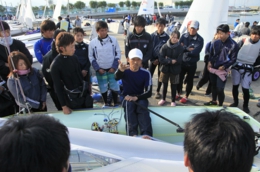 りません。ここで470協会の新理事で元ナショナルチームの渡邊哲雄理事の提案で、関一人、松永鉄也、近藤愛、吉迫由香、原田龍之介、吉田雄悟らオリンピック選手による講習会が企画されました。選手達は、4グループに分かれ、五輪選手の艤装方法やレースの戦い方などをレクチャー。普段、オリンピック選手と接触する機会の無い学生選手など、熱心に話しを聞いてメモを取ったり質問したりで、大変良い機会になったようでした。
